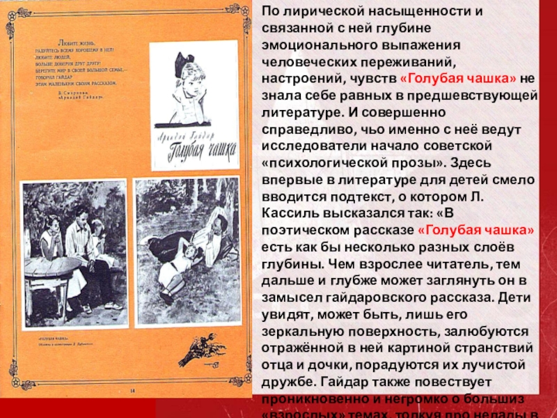 переживаний, настроений, чувств «Голубая чашка» не знала себе равных в предшевствующей литературе. И совершенно справедливо, чьо именно с неё ведут исследователи начало советской «психологической прозы». Здесь впервые в литературе для детей смело вводится подтекст, о котором Л.Кассиль высказался так: «В поэтическом рассказе «Голубая чашка» есть как бы несколько разных слоёв глубины. Чем взрослее читатель, тем дальше и глубже может заглянуть он в замысел гайдаровского рассказа. Дети увидят, может быть, лишь его зеркальную поверхность, залюбуются отражённой в ней картиной странствий отца и дочки, порадуются их лучистой дружбе. Гайдар также повествует проникновенно и негромко о большиз «взрослых» темах, толкуя про нелады в семье, горькую любовь, про славную дружбу больших и маленьких»