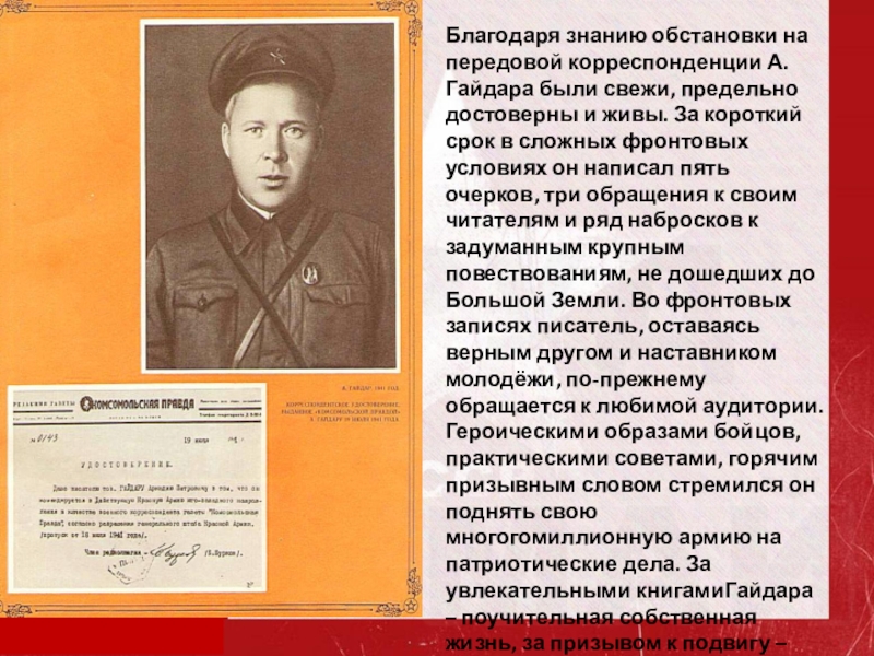 Слайд 17Благодаря знанию обстановки на передовой корреспонденции А.Гайдара были свежи, предельно достоверны
