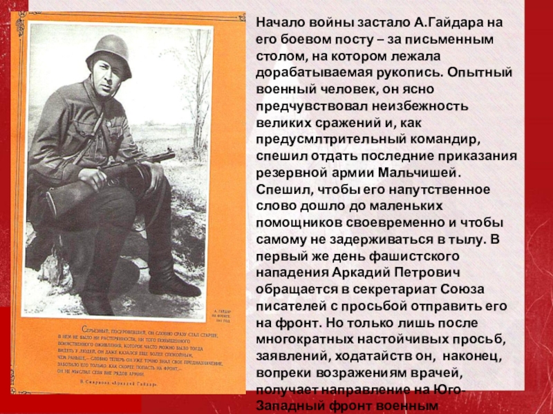 Слайд 16Начало войны застало А.Гайдара на его боевом посту – за письменным