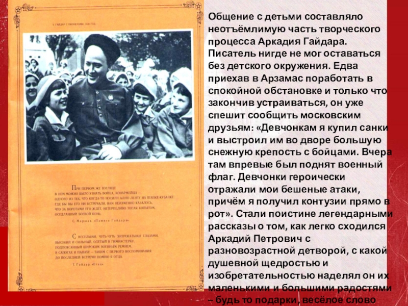 Слайд 13Общение с детьми составляло неотъёмлимую часть творческого процесса Аркадия Гайдара. Писатель