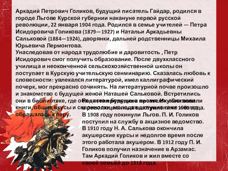 Слайд 2Аркадий Петрович Голиков, будущий писатель Гайдар, родился в городе Льгове Курской