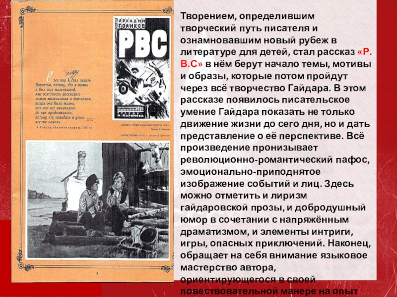 для детей, стал рассказ «Р.В.С» в нём берут начало темы, мотивы и образы, которые потом пройдут через всё творчество Гайдара. В этом рассказе появилось писательское умение Гайдара показать не только движение жизни до сего дня, но и дать представление о её перспективе. Всё произведение пронизывает революционно-романтический пафос, эмоционально-приподнятое изображение событий и лиц. Здесь можно отметить и лиризм гайдаровской прозы, и добродушный юмор в сочетании с напряжённым драматизмом, и элементы интриги, игры, опасных приключений. Наконец, обращает на себя внимание языковое мастерство автора, ориентирующегося в своей повествовательной манере на опыт детского речевого общения.
