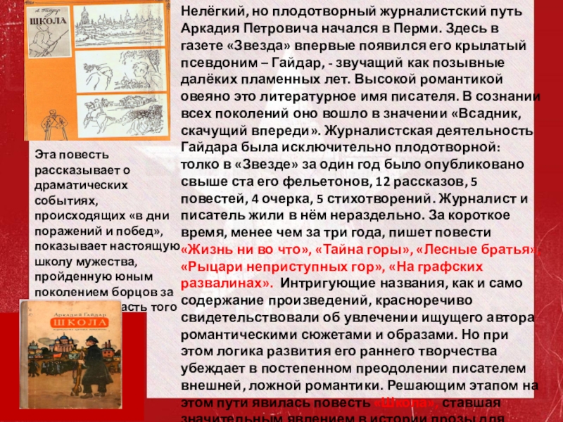в газете «Звезда» впервые появился его крылатый псевдоним – Гайдар, - звучащий как позывные далёких пламенных лет. Высокой романтикой овеяно это литературное имя писателя. В сознании всех поколений оно вошло в значении «Всадник, скачущий впереди». Журналистская деятельность Гайдара была исключительно плодотворной: толко в «Звезде» за один год было опубликовано свыше ста его фельетонов, 12 рассказов, 5 повестей, 4 очерка, 5 стихотворений. Журналист и писатель жили в нём нераздельно. За короткое время, менее чем за три года, пишет повести «Жизнь ни во что», «Тайна горы», «Лесные братья», «Рыцари неприступных гор», «На графских развалинах». Интригующие названия, как и само содержание произведений, красноречиво свидетельствовали об увлечении ищущего автора романтическими сюжетами и образами. Но при этом логика развития его раннего творчества убеждает в постепенном преодолении писателем внешней, ложной романтики. Решающим этапом на этом пути явилась повесть «Школа», ставшая значительным явлением в истории прозы для детей.