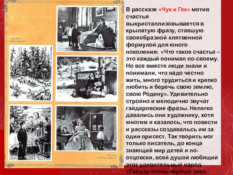 Слайд 12В рассказе «Чук и Гек» мотив счастья выкристаллизовывается в крылатую фразу,