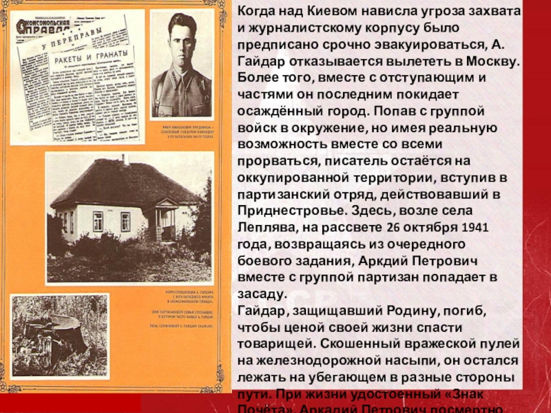 срочно эвакуироваться, А.Гайдар отказывается вылететь в Москву. Более того, вместе с отступающим и частями он последним покидает осаждённый город. Попав с группой войск в окружение, но имея реальную возможность вместе со всеми прорваться, писатель остаётся на оккупированной территории, вступив в партизанский отряд, действовавший в Приднестровье. Здесь, возле села Леплява, на рассвете 26 октября 1941 года, возвращаясь из очередного боевого задания, Аркдий Петрович вместе с группой партизан попадает в засаду.
