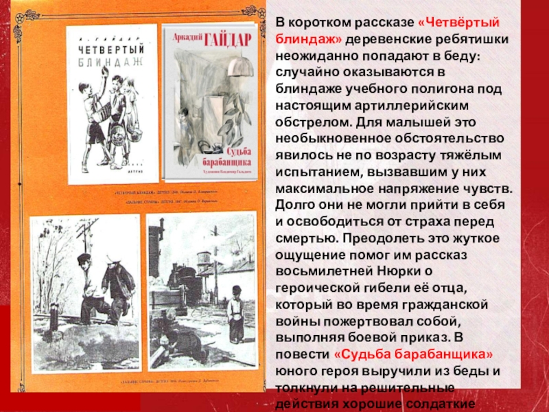 случайно оказываются в блиндаже учебного полигона под настоящим артиллерийским обстрелом. Для малышей это необыкновенное обстоятельство явилось не по возрасту тяжёлым испытанием, вызвавшим у них максимальное напряжение чувств. Долго они не могли прийти в себя и освободиться от страха перед смертью. Преодолеть это жуткое ощущение помог им рассказ восьмилетней Нюрки о героической гибели её отца, который во время гражданской войны пожертвовал собой, выполняя боевой приказ. В повести «Судьба барабанщика» юного героя выручили из беды и толкнули на решительные действия хорошие солдаткие песни, которые часто напевал ему отец.