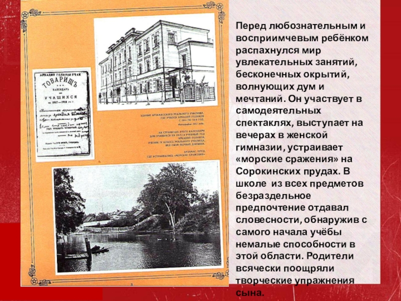 волнующих дум и мечтаний. Он участвует в самодеятельных спектаклях, выступает на вечерах в женской гимназии, устраивает «морские сражения» на Сорокинских прудах. В школе из всех предметов безраздельное предпочтение отдавал словесности, обнаружив с самого начала учёбы немалые способности в этой области. Родители всячески поощряли творческие упражнения сына.