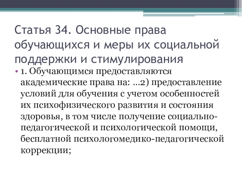 1. Обучающимся предоставляются академические права на: …2) предоставление условий для обучения с учетом особенностей их психофизического развития и состояния здоровья, в том числе получение социально-педагогической и психологической помощи, бесплатной психологомедико-педагогической коррекции;