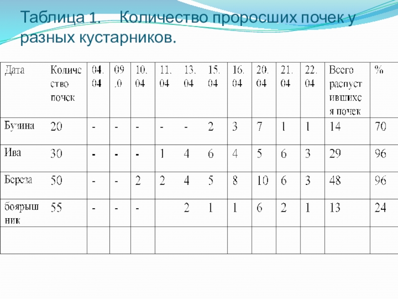Слайд 7Таблица 1. Количество проросших почек у разных кустарников.