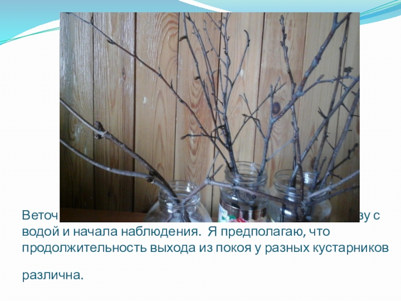 Слайд 6Веточки принесла домой, подписала и поставила в вазу с водой и
