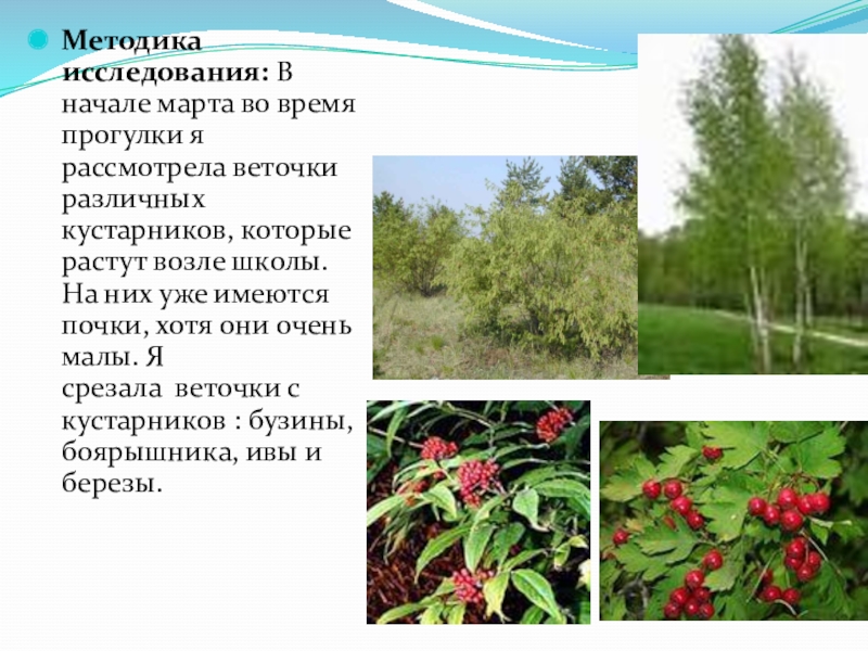 Слайд 5Методика исследования: В начале марта во время прогулки я рассмотрела веточки