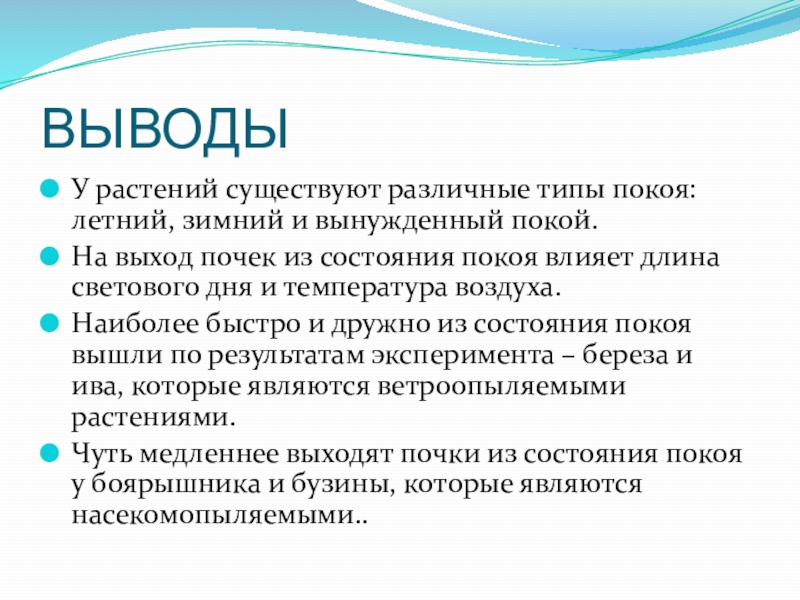Наиболее быстро и дружно из состояния покоя вышли по результатам эксперимента – береза и ива, которые являются ветроопыляемыми растениями.