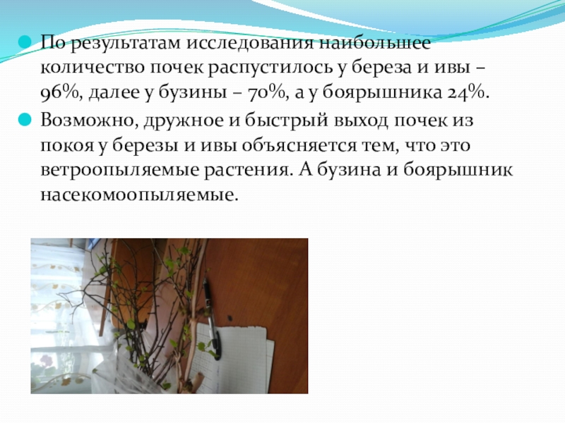 Слайд 8По результатам исследования наибольшее количество почек распустилось у береза и ивы