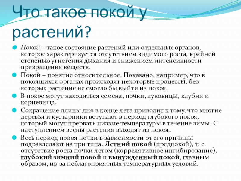 У растений существуют различные типы покоя: летний, зимний и вынужденный покой.