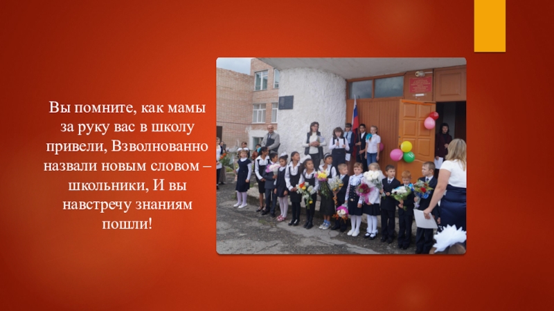Вы помните, как мамы за руку вас в школу привели, Взволнованно назвали новым словом – школьники,