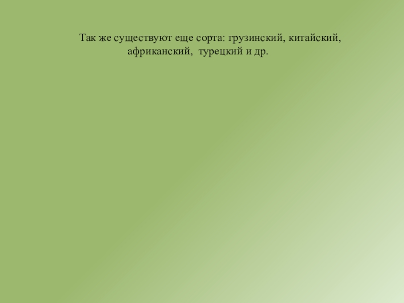 Слайд 17Так же существуют еще сорта: грузинский, китайский, африканский, турецкий и др.