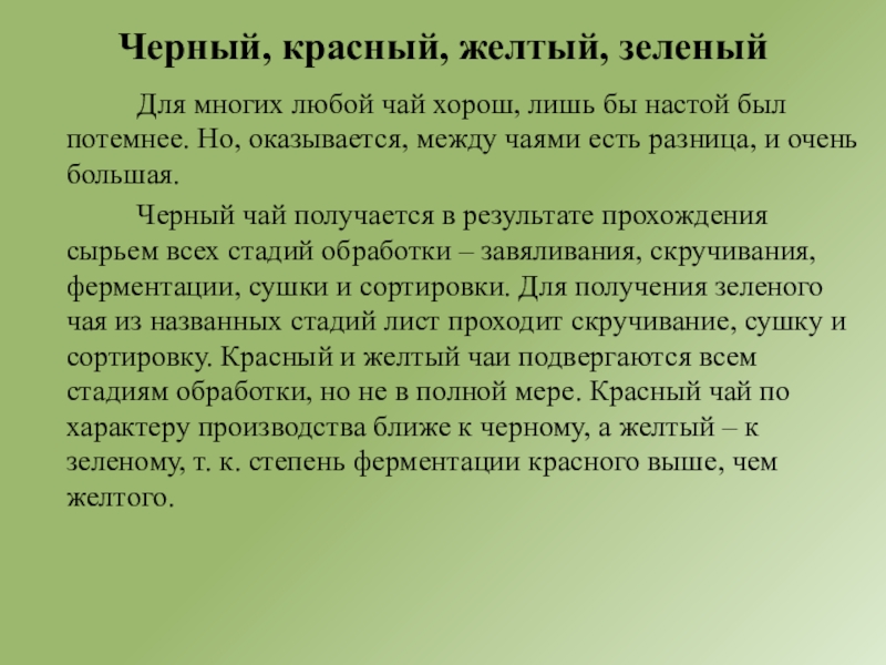 Черный чай получается в результате прохождения сырьем всех стадий обработки – завяливания, скручивания, ферментации, сушки и сортировки. Для получения зеленого чая из названных стадий лист проходит скручивание, сушку и сортировку. Красный и желтый чаи подвергаются всем стадиям обработки, но не в полной мере. Красный чай по характеру производства ближе к черному, а желтый – к зеленому, т. к. степень ферментации красного выше, чем желтого.