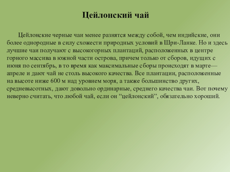 более однородные в силу схожести природных условий в Шри-Ланке. Но и здесь лучшие чаи получают с высокогорных плантаций, расположенных в центре горного массива в южной части острова, причем только от сборов, идущих с июня по сентябрь, в то время как максимальные сборы происходят в марте—апреле и дают чай не столь высокого качества. Все плантации, расположенные на высоте ниже 600 м над уровнем моря, а также большинство других, средневысотных, дают довольно ординарные, среднего качества чаи. Вот почему неверно считать, что любой чай, если он “цейлонский”, обязательно хороший.