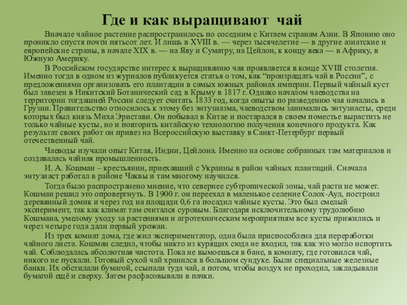 И. А. Кошман – крестьянин, приехавший с Украины в район чайных плантаций. Сначала энтузиаст работал в районе Чаквы и там многому научился.