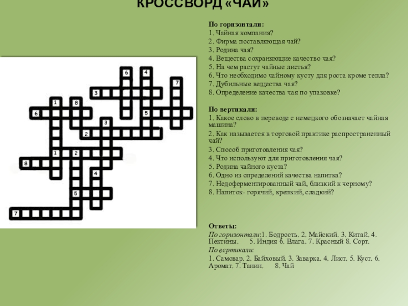 1. Самовар. 2. Байховый. 3. Заварка. 4. Лист. 5. Куст. 6.Аромат. 7. Танин. 8. Чай