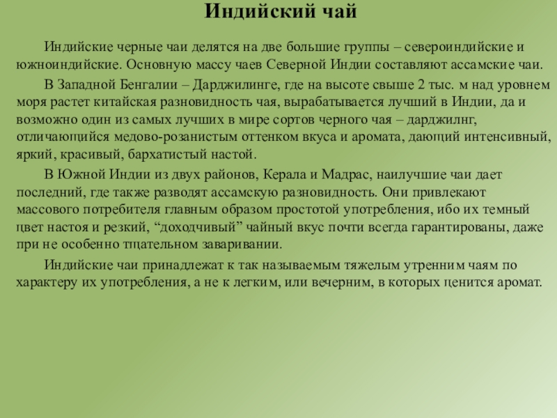 Индийские чаи принадлежат к так называемым тяжелым утренним чаям по характеру их употребления, а не к легким, или вечерним, в которых ценится аромат.