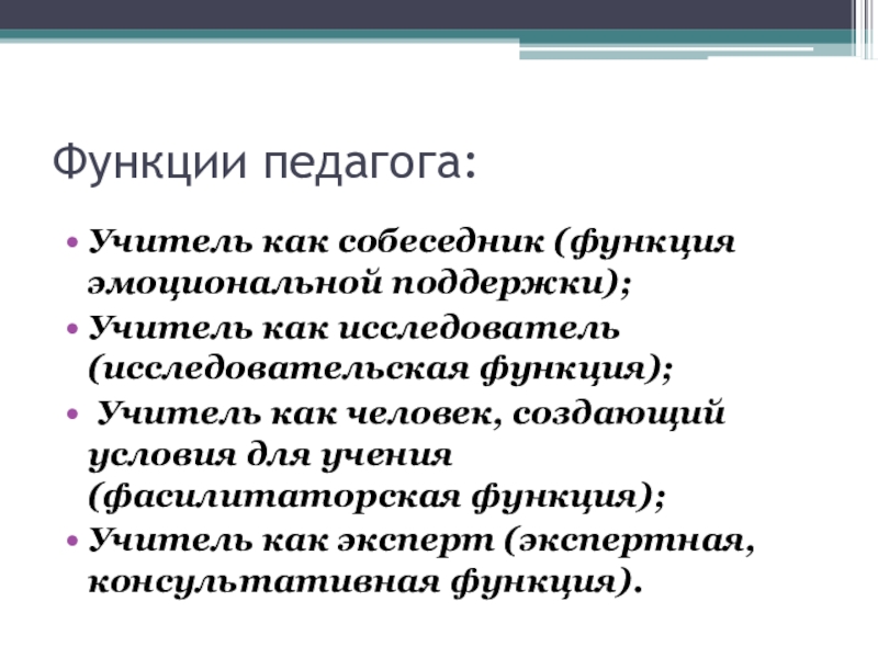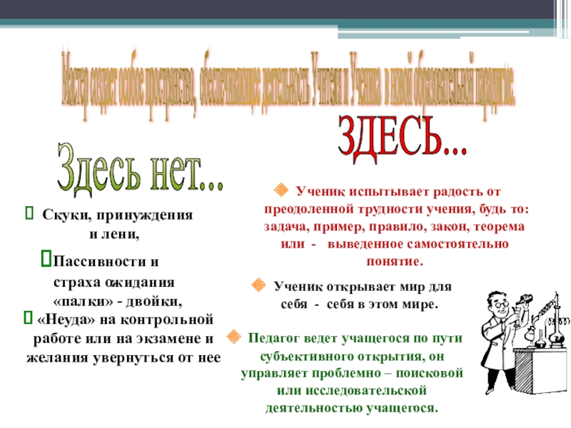 Педагог ведет учащегося по пути субъективного открытия, он управляет проблемно – поисковой или исследовательской деятельностью учащегося.