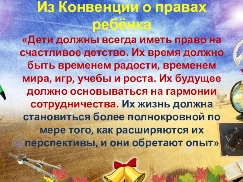 детство. Их время должно быть временем радости, временем мира, игр, учебы и роста. Их будущее должно основываться на гармонии сотрудничества. Их жизнь должна становиться более полнокровной по мере того, как расширяются их перспективы, и они обретают опыт»