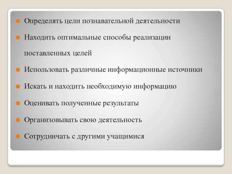 Определять цели познавательной деятельностиНаходить оптимальные способы реализации поставленных целейИспользовать различные информационные источникиИскать и находить необходимую информациюОценивать полученные
