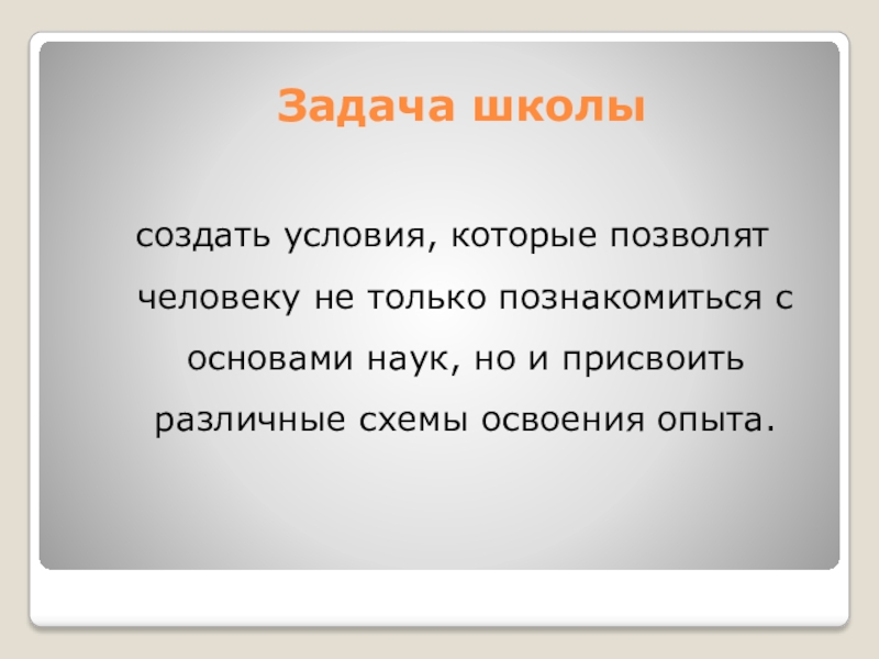 Задача школысоздать условия, которые позволят человеку не только познакомиться с основами наук, но и присвоить различные схемы освоения опыта.
