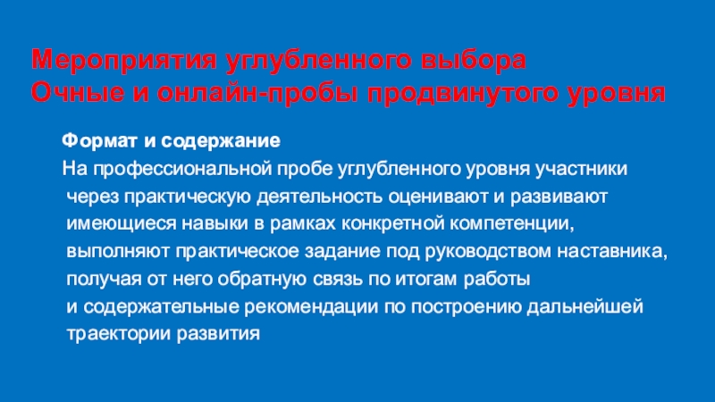 На профессиональной пробе углубленного уровня участники через практическую деятельность оценивают и развивают имеющиеся навыки в рамках конкретной компетенции, выполняют практическое задание под руководством наставника, получая от него обратную связь по итогам работы и содержательные рекомендации по построению дальнейшей траектории развития