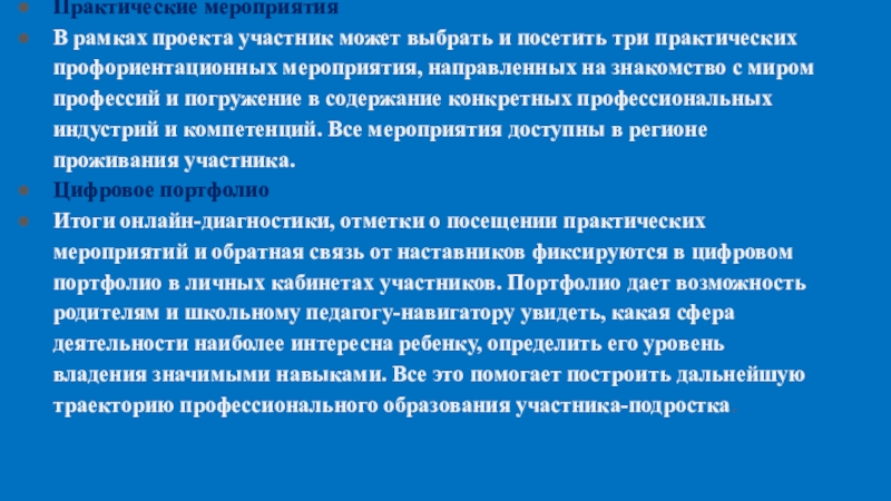 направленных на знакомство с миром профессий и погружение в содержание конкретных профессиональных индустрий и компетенций. Все мероприятия доступны в регионе проживания участника.