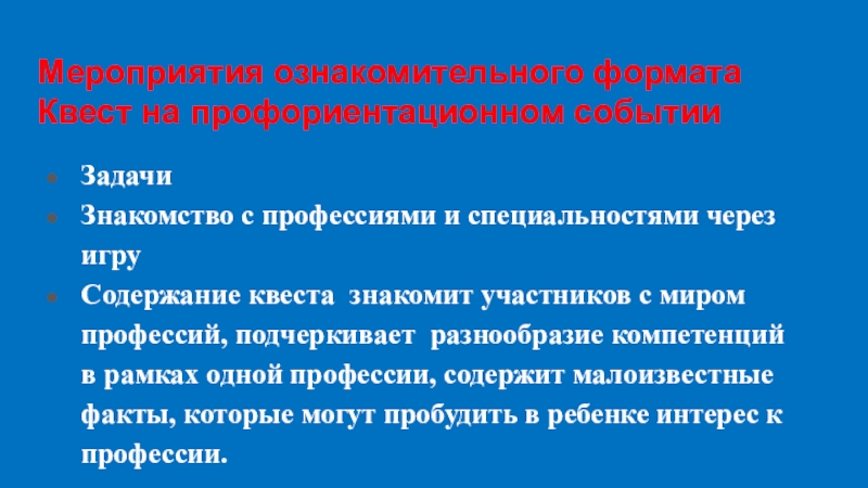 участников с миром профессий, подчеркивает разнообразие компетенций в рамках одной профессии, содержит малоизвестные факты, которые могут пробудить в ребенке интерес к профессии.