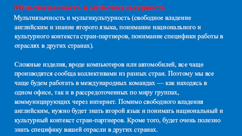 Сложные изделия, вроде компьютеров или автомобилей, все чаще производятся сообща коллективами из разных стран. Поэтому мы все чаще будем работать в международных командах — как находясь в одном офисе, так и в расcредоточенных по миру группах, коммуницирующих через интернет. Помимо свободного владения английским, нужно будет знать второй язык и понимать национальный и культурный контекст стран-партнеров. Кроме того, будет очень полезно знать специфику вашей отрасли в других странах.