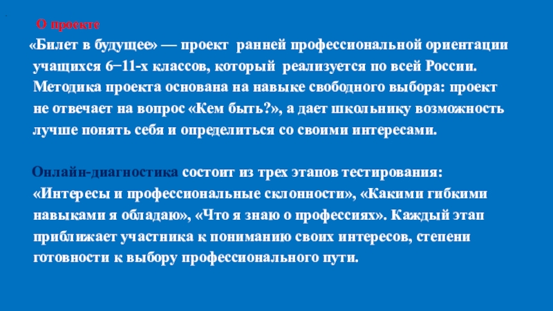 ранней профессиональной ориентации учащихся 6−11-х классов, который реализуется по всей России. Методика проекта основана на навыке свободного выбора: проект не отвечает на вопрос «Кем быть?», а дает школьнику возможность лучше понять себя и определиться со своими интересами.