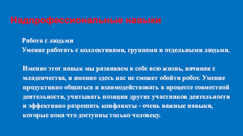 Именно этот навык мы развиваем в себе всю жизнь, начиная с младенчества, и именно здесь нас не сможет обойти робот. Умение продуктивно общаться и взаимодействовать в процессе совместной деятельности, учитывать позиции других участников деятельности и эффективно разрешать конфликты - очень важные навыки, которые пока что доступны только человеку.