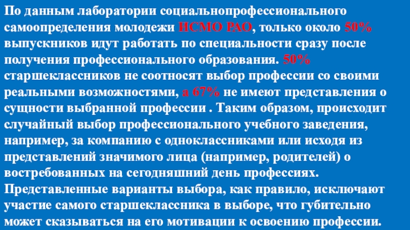 Слайд 3По данным лаборатории социальнопрофессионального самоопределения молодежи ИСМО РАО, только около 50%