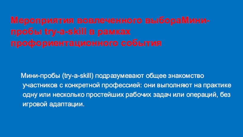 Слайд 22Мероприятия вовлеченного выбораМини-пробы try-a-skill в рамках профориентационного события