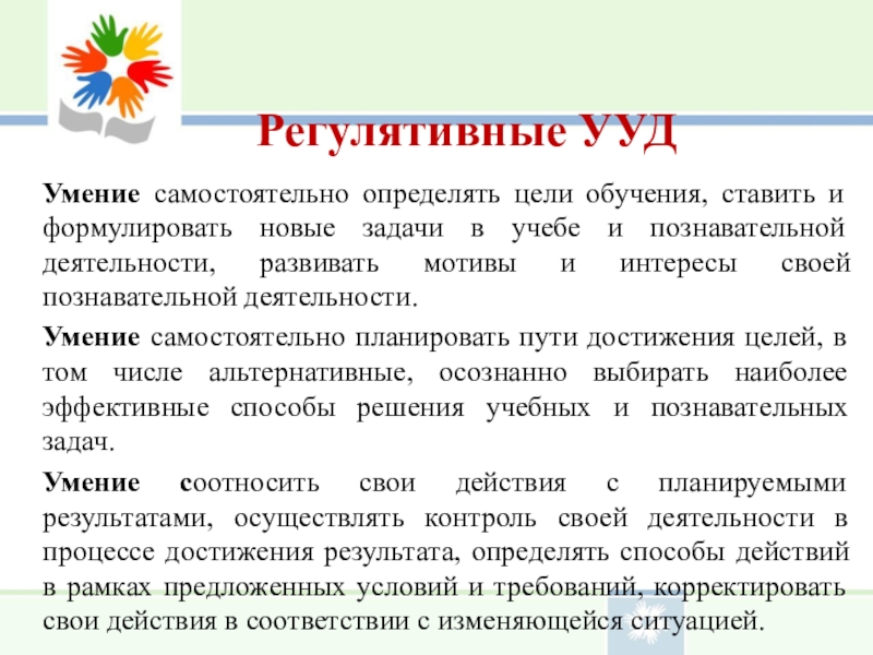 Умение соотносить свои действия с планируемыми результатами, осуществлять контроль своей деятельности в процессе достижения результата, определять способы действий в рамках предложенных условий и требований, корректировать свои действия в соответствии с изменяющейся ситуацией.