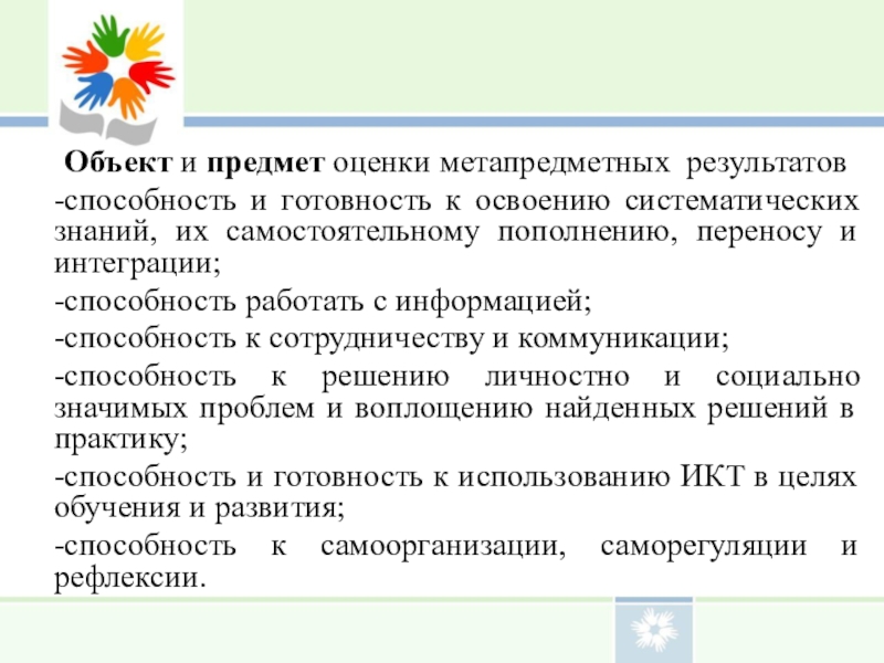 Слайд 13Объект и предмет оценки метапредметных результатов