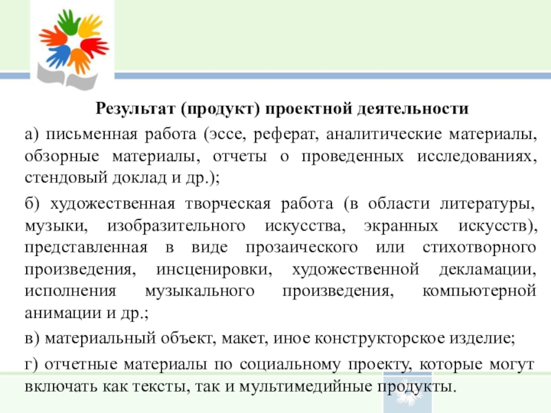 г) отчетные материалы по социальному проекту, которые могут включать как тексты, так и мультимедийные продукты.