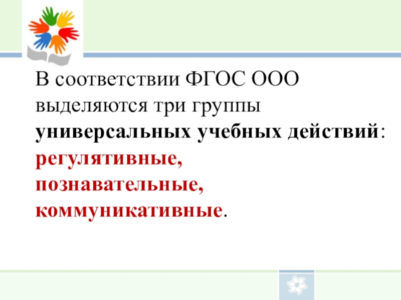 Слайд 5В соответствии ФГОС ООО выделяютcя три группы универсальных учебных действий: