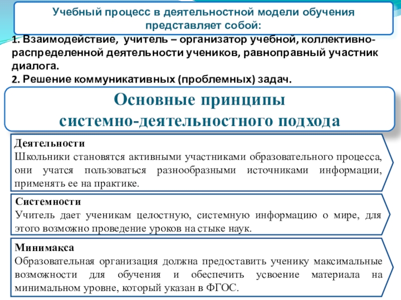1. Взаимодействие, учитель – организатор учебной, коллективно-распределенной деятельности учеников, равноправный участник диалога.