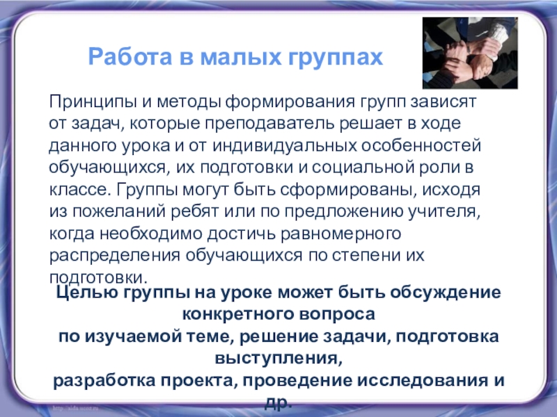 Целью группы на уроке может быть обсуждение конкретного вопроса