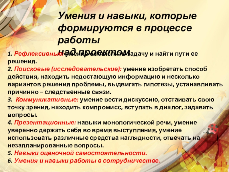 4. Презентационные: навыки монологической речи, умение уверенно держать себя во время выступления, умение использовать различные средства наглядности, отвечать на незапланированные вопросы.