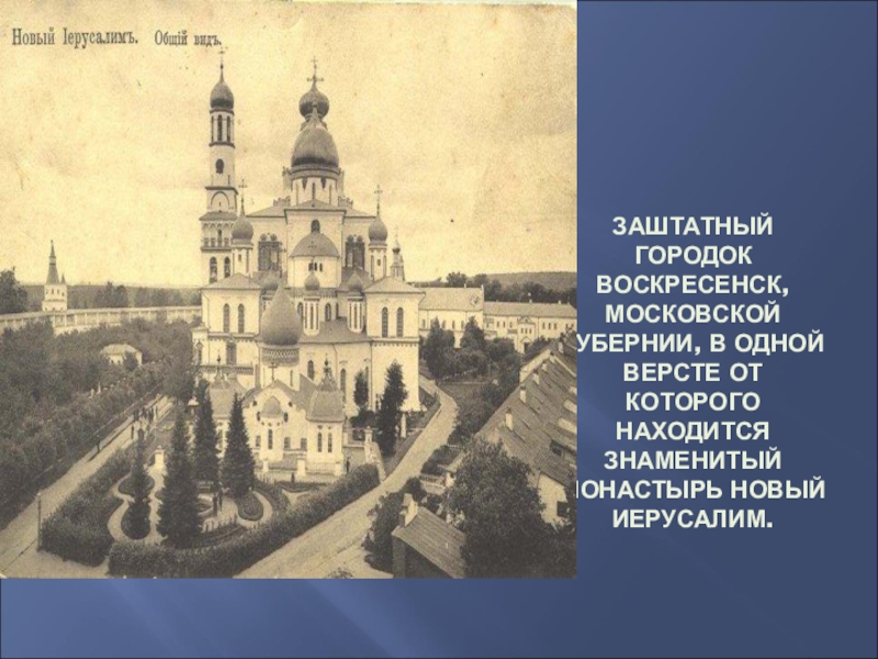 ЗАШТАТНЫЙ ГОРОДОК ВОСКРЕСЕНСК, МОСКОВСКОЙ ГУБЕРНИИ, В ОДНОЙ ВЕРСТЕ ОТ КОТОРОГО НАХОДИТСЯ ЗНАМЕНИТЫЙ МОНАСТЫРЬ НОВЫЙ ИЕРУСАЛИМ.