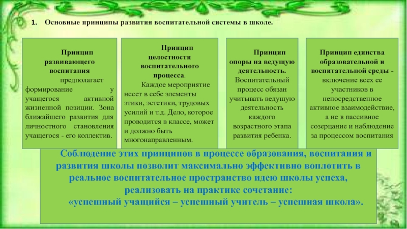 Соблюдение этих принципов в процессе образования, воспитания и развития школы позволит максимально эффективно воплотить в реальное воспитательное пространство идею школы успеха, реализовать на практике сочетание: