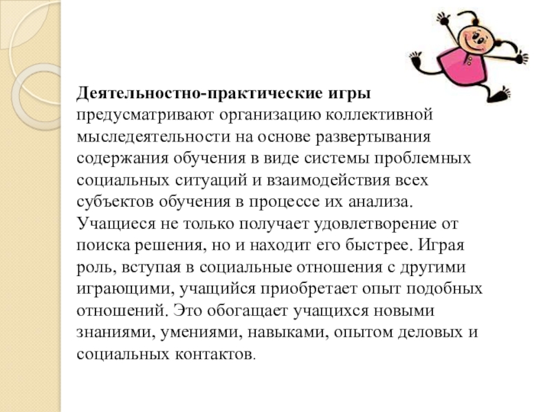 Деятельностно-практические игры предусматривают организацию коллективной мыследеятельности на основе развертывания содержания обучения