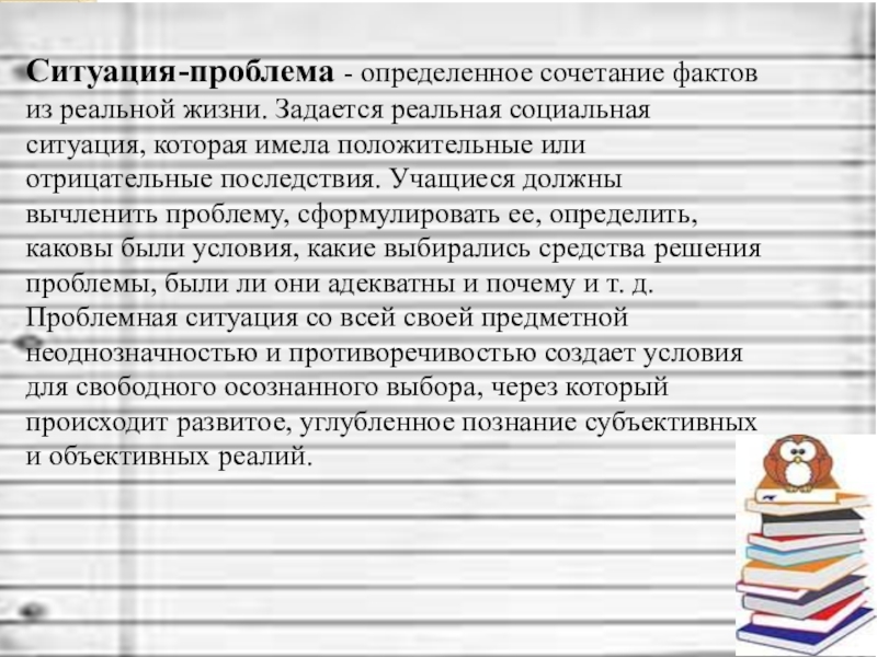 Ситуация-проблема - определенное сочетание фактов из реальной жизни. Задается реальная социальная