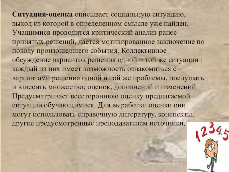 найден. Учащимися проводится критический анализ ранее принятых решений, дается мотивированное заключение по поводу произошедшего события. Коллективное обсуждение вариантов решения одной и той же ситуации : каждый из них имеет возможность ознакомиться с вариантами решения одной и той же проблемы, послушать и взвесить множество; оценок, дополнений и изменений. Предусматривает всестороннюю оценку предлагаемой ситуации обучающимися. Для выработки оценки они могут использовать справочную литературу, конспекты, другие предусмотренные преподавателем источники.