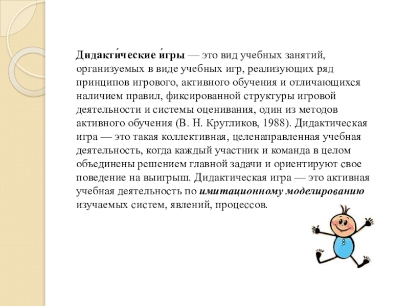 игр, реализующих ряд принципов игрового, активного обучения и отличающихся наличием правил, фиксированной структуры игровой деятельности и системы оценивания, один из методов активного обучения (В. Н. Кругликов, 1988). Дидактическая игра — это такая коллективная, целенаправленная учебная деятельность, когда каждый участник и команда в целом объединены решением главной задачи и ориентируют свое поведение на выигрыш. Дидактическая игра — это активная учебная деятельность по имитационному моделированию изучаемых систем, явлений, процессов.